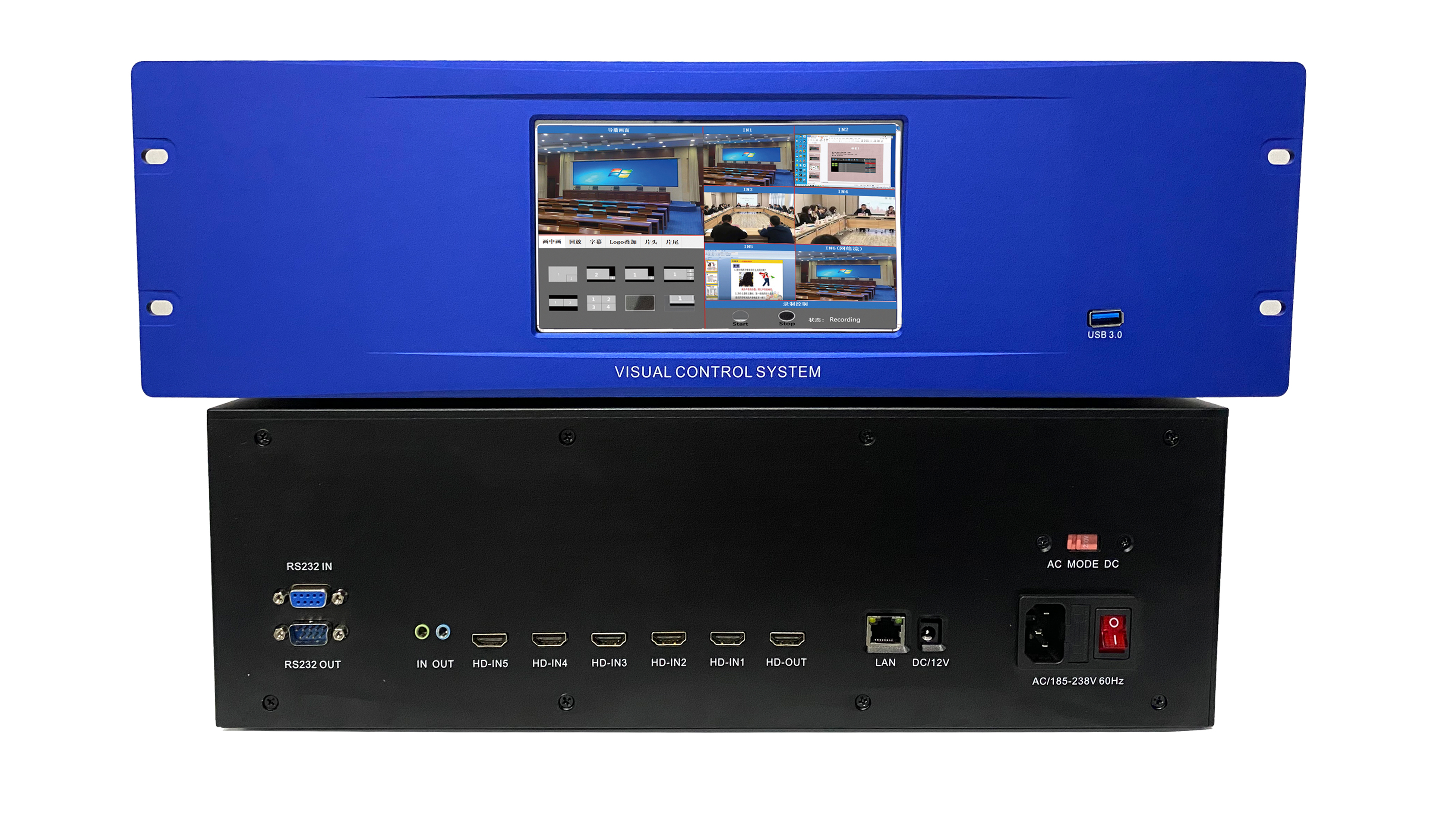 7、前面板带有7寸可触摸屏显示屏,支持多流视频直播,6路直播画面可以任意切换位置,并且可以对每1路画面进行全屏处理;